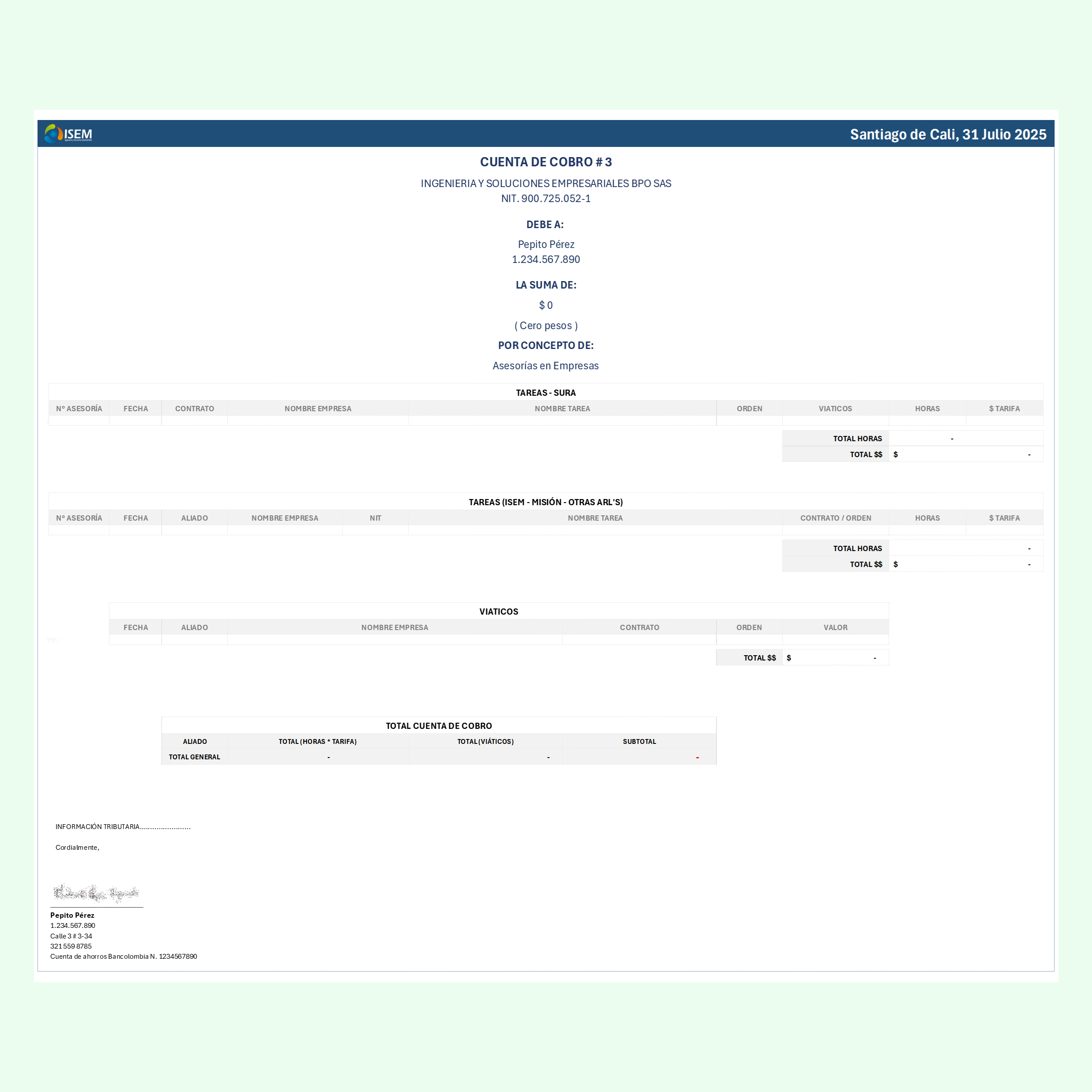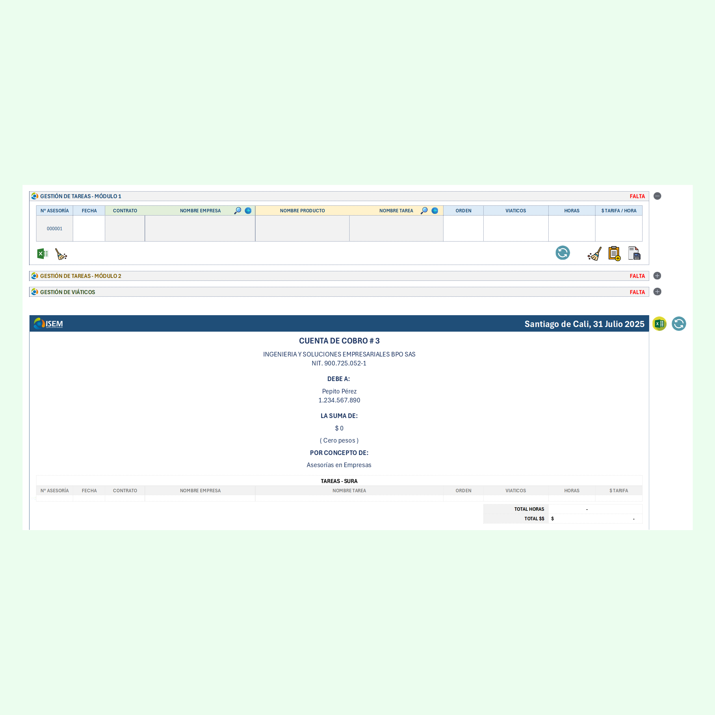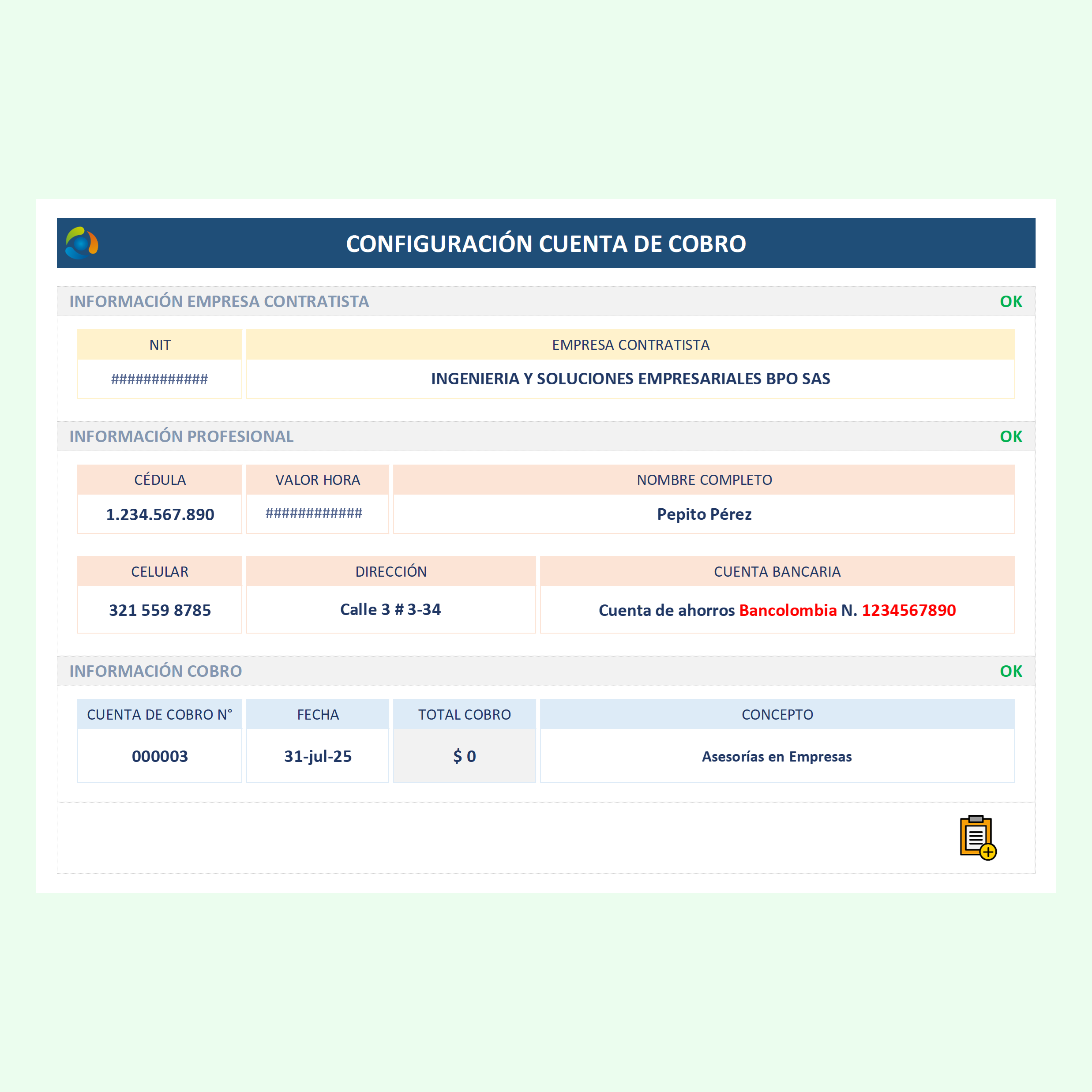 Herramienta desarrollada en Microsoft Excel con macros en VBA, diseñada para la creación, gestión y control eficiente de cuentas de cobro del personal interno y externo de tu empresa. Facilita el registro estructurado, automatiza cálculos clave y estandariza el proceso de generación de documentos, reduciendo errores y mejorando la trazabilidad administrativa. Ideal para organizaciones que buscan optimizar sus procesos contables sin depender de sistemas complejos.